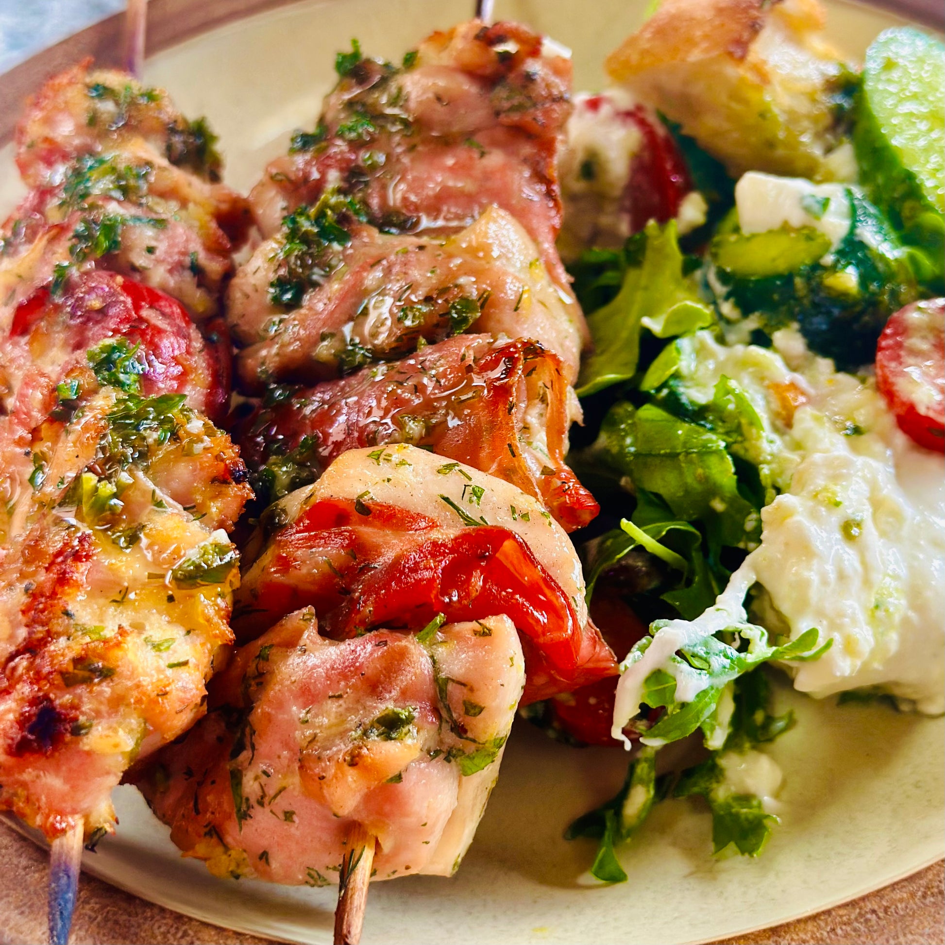 Chicken Spiedini Bites with Garlic Drizzle and Creamy Dip